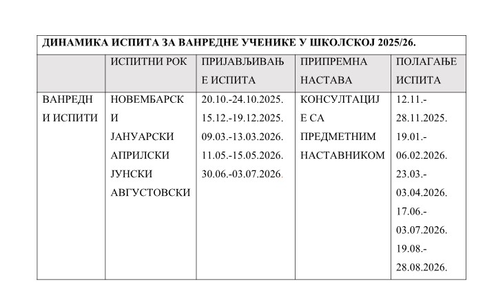 Обавештење за ванредне ученике – школска 2025/2026. година