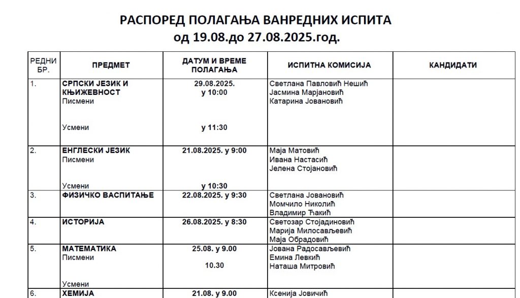 РАСПОРЕД ВАНРЕДНИХ ИСПИТА У АВГУСТОВСКОМ ИСПИТОМ РОКУ